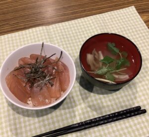 #就労支援B型 ANGELです😊今日のランチはマグロの漬け丼、お吸い物でした✨三つ葉も入っていて彩りが綺麗でした🌱