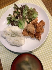 本日のランチは唐揚げとサラダ、お味噌汁でした!衣サクサクです🍽️