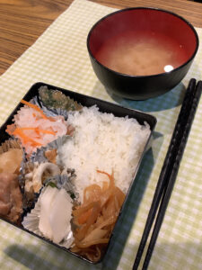 本日のランチは!鶏肉と大根の煮物などおかずが数種類入った職員お手製のお弁当、お味噌汁でした🍱✨