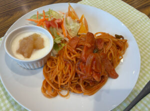 本日のランチは職員お手製ナポリタン、サラダ、フルーツ、ヨーグルトでした🤤