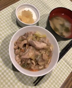 本日のランチは、鶏もも肉と野菜の煮込み丼、お味噌汁、りんごヨーグルトでした✨